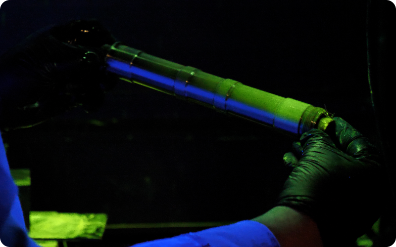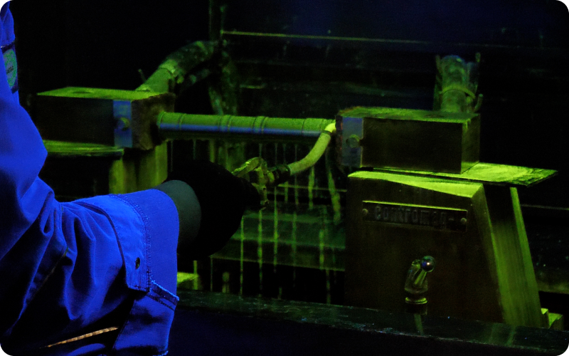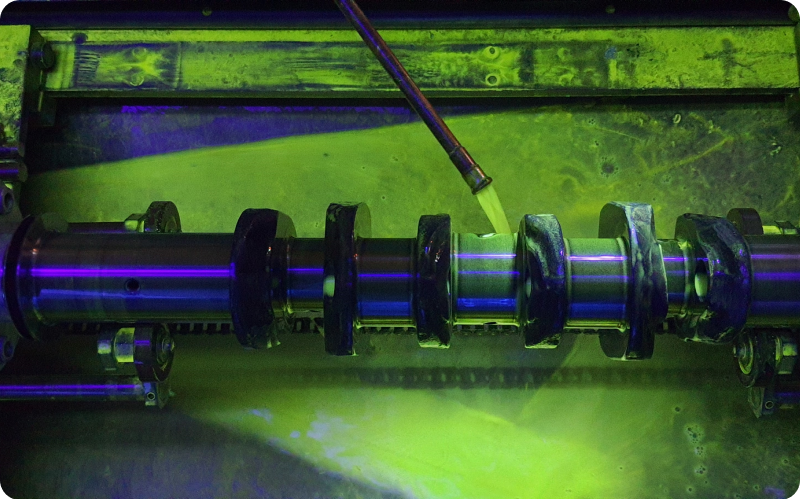Inspection visuelle : L’inspection est ensuite réalisée sous une lumière adéquate (souvent une lumière noire si le fluide est fluorescent), afin de détecter la présence de défauts visibles à la surface
