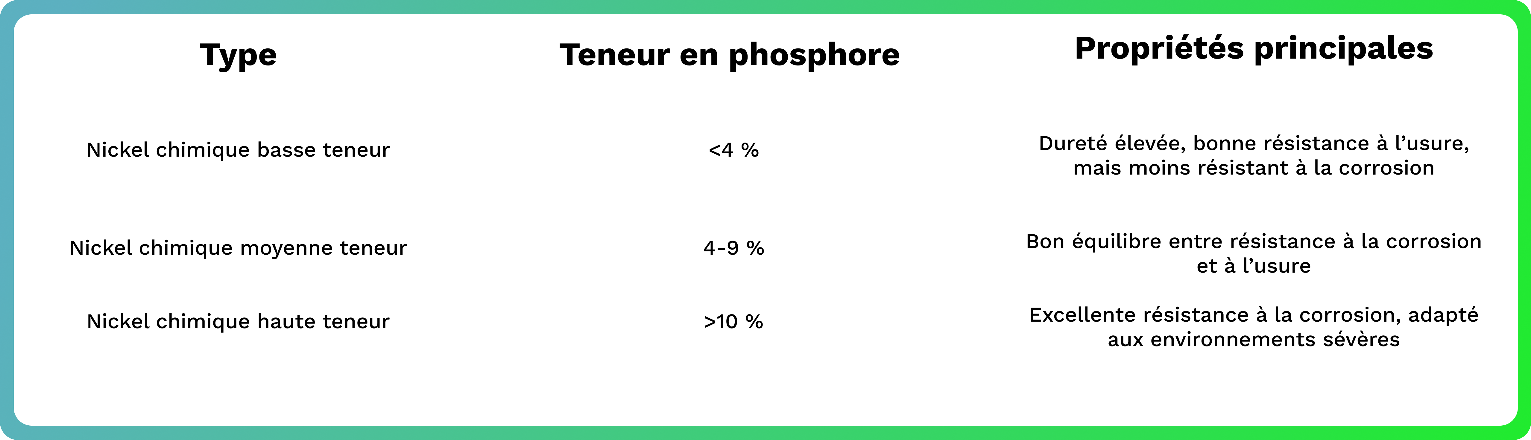 Composition : Nickel et phosphore, avec des teneurs en phosphore variant (basse, moyenne, haute teneur).